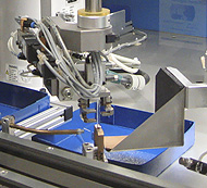 Производство прецизионных ламп данного типа требует высочайшего качества и надежности с учетом даже малейших деталей. Для соответствия столь высоким требованиям были разработаны и изготовлены специальные крайне сложные полностью автоматизированные и полу-автоматизированные системы. Роботы должны были быть крайне точными и работать максимально быстро, чтобы обеспечить необходимую пропускную способность линии. ВидеороликРешениеВ двух рабочих точках лампы осветительных приборов вручную помещаются в специальные рамы. Затем в открытые лампы сверху вниз вставляется световая нить. Сама световая нить представляет собой прочную вольфрамовую нить размером лишь 0,1 мм с соединениями для подвода рабочего напряжения. Данные соединения подключаются к нити механически с помощью капли стекла. В каждой раме предусмотрено по 22 гнезда для ламп. Полностью укомплектованные рамы подъемником передаются в робототехническую ячейку. Лазерный сканер проверяет наличие лампы в каждом гнезде. После завершения проверки предварительно собранное изделие помещается в барабан на вращающемся столе.
