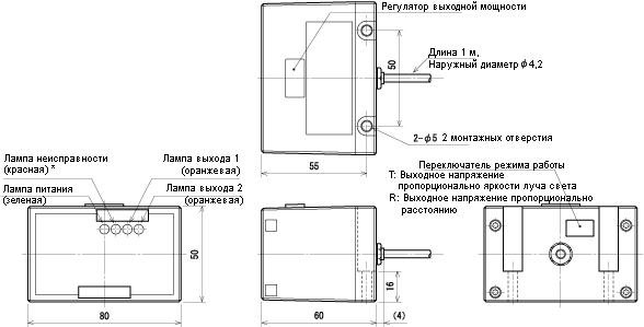 Выход на основе NPN-транзистора с открытым коллектором (30 В пост. тока, не более 50 мА), ВКЛ при нормальной работе/ВЫКЛ при нахождении вне зоны обнаружения или если уровень улавливаемого света ниже номинального значения |