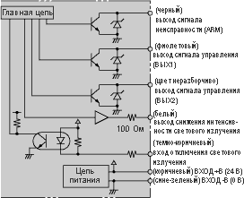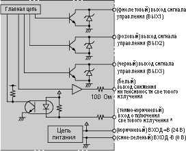 Контактный или транзисторный вход, излучение прекращается при коротком замыкании на -VIN(0 В) (загорается сигнальная лампа) |