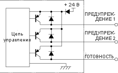 Выходы ПРЕДУПРЕЖДЕНИЕ 1, ПРЕДУПРЕЖДЕНИЕ 2, ГОТОВНОСТЬ - на основе PNP-транзистора.