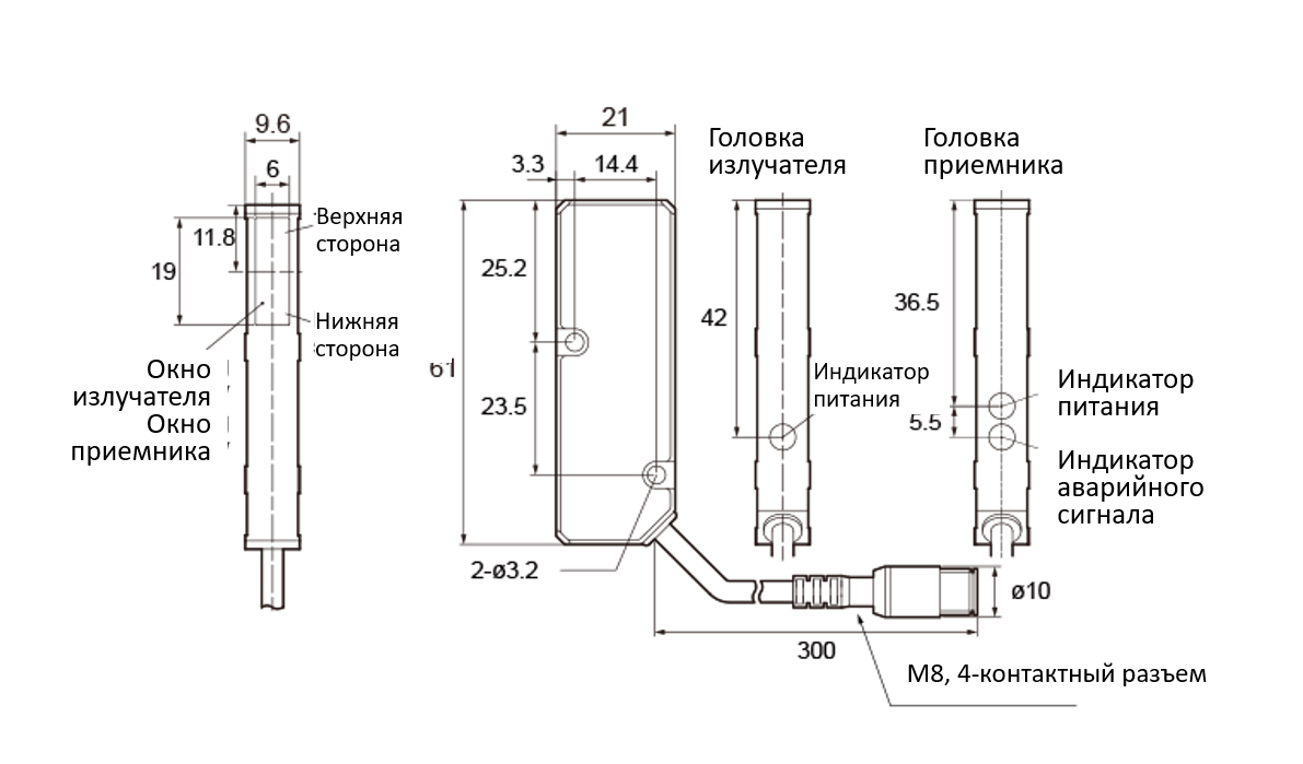 [Головка излучателя] Индикатор питания: зеленый [Головка приемника] Индикатор питания: зеленый, Индикатор аварийной сигнализации: красный |