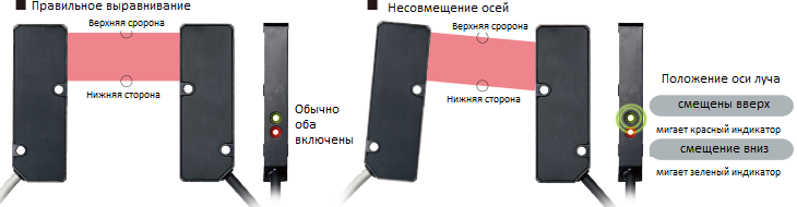 В режиме проверки направления оси луча индикатор будет мигать, пока ось смещена, сигнализируя о необходимости выравнивания. Функция выравнивания упрощает проверку оси луча при монтаже датчиков или при периодическом обслуживании.
