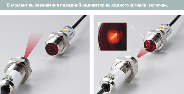 Индикатор видимости выходного луча излучателя оборудован не только на корпусе приемника, но и в оптическом окне. В процессе наведения светового луча излучателем, индикатор принимаемого света виден в окне со стороны излучателя, что позволяет настроить датчик одним оператором.
