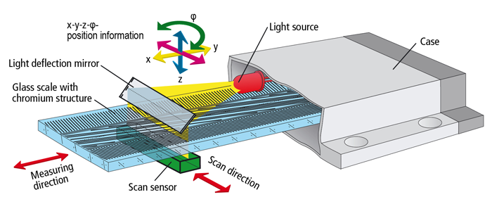 Линейные измерительные системы серии LT от компании TR работают по принципу фотоэлектрического сканирования стеклянной шкалы с абсолютным кодированием. Сенсорная матрица сканирует несколько дорожек с измеренными данными высокого разрешения о 3D-координатах и угловом положении между стеклянной линейкой и сканирующим устройством. При оценке измерительных сигналов по сигналу датчика определяется закодированное положение измерения, затем ошибки в направлении и регулировке исправляются с использованием дополнительной измерительной информации.