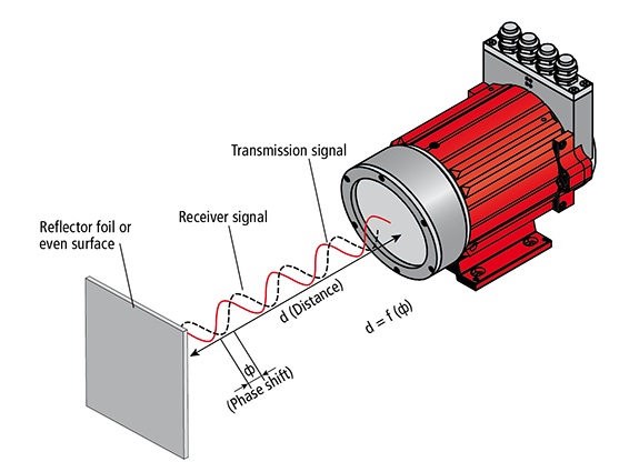 Расположенные в устройстве лазерные диоды направляют модулированный световой луч, который отражается от отражателя с ровной поверхностью и вновь поступает на детектор в устройстве. Расстояние рассчитывается по разности фаз между отправленным и принятым световым лучом.
