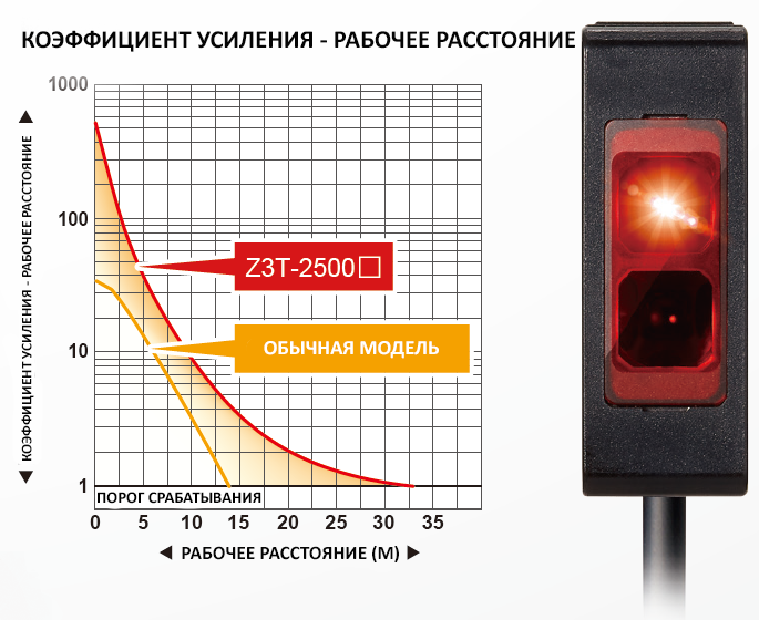 Однопроходной датчик серии Z3 имеет рабочее расстояние 25 м, самое большое в своем классе. Высокая мощность обеспечивает значительное увеличение коэффициента усиления, что позволяет датчику преодолевать помехи от пыли или других мелких частиц.