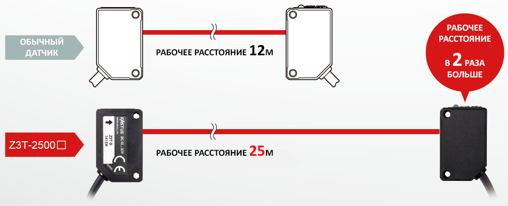 - Однопроходный датчик с большим рабочим расстоянием - 25 м