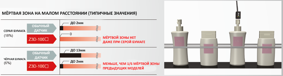 Диффузный тип датчика оснащен оптимизированным приемником, что позволяет успешно минимизировать мертвую зону перед линзами. Это упрощает обнаружение объектов с низкой отражательной способностью, которые проходят вблизи датчика, даже на линиях транспортировки объектов различной высоты.