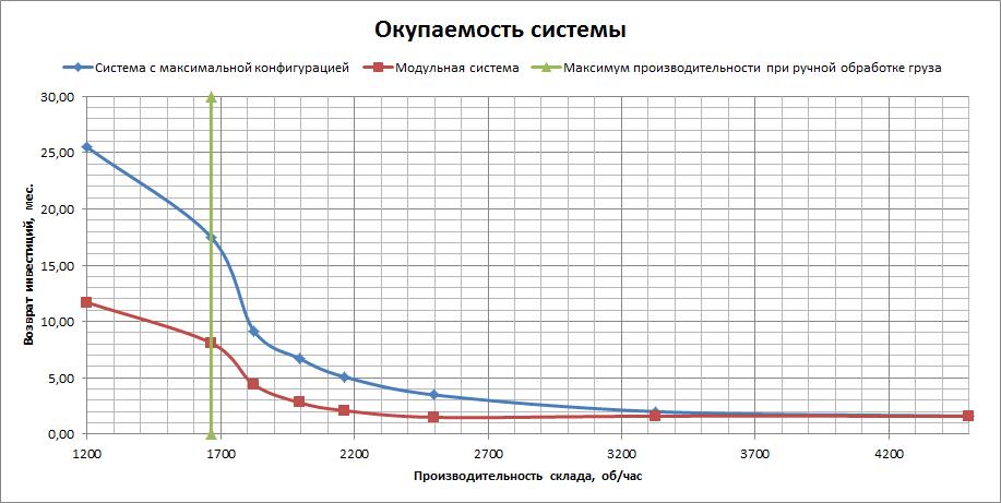 Использование подобных систем позволяет проектировать автоматизацию распределительного центра исходя из долгосрочных планов развития компании, но внедрять лишь часть этого решения. Учет специфики роста производительности на разных этапах позволяет оптимизировать внедряемое решение. Например, внедрение системы измерения габаритов и веса при переходе через производительность в 1000 об/час, когда система становится окупаемой, или начало использования сортировочных узлов при увеличении производительности более 1500 об/час. Работа с модульной системой дает возможность проектировать индивидуальные решения на базе компонентов, что позволяет адаптировать автоматизацию под сегодняшние нужды склада и наращивать систему непосредственно с ростом мощностей, дозируя инвестиции и получая максимально быстрый возврат вложении. Одним словом, мы используем только то, что возвращает предприятию деньги, не переплачивая за то, что использоваться будет только в будущем, а возможно и вовсе использоваться не будет.