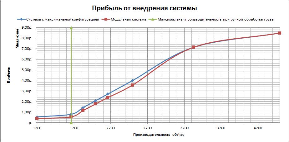 Ниже представлены результаты расчета прибыли от внедрения системы и ее окупаемости по одному из реализованных ООО «Сенсотек» проектов. На рис.1 изображен график возврата инвестиций при использовании модульной системы и график возврата инвестиций от внедрения системы, спроектированной под увеличение производительности в 2,5 раза.