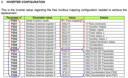 Как видно из схемы, сам процесс настройки предельно прост. В первую группу параметров (P201-209) заносится адресация параметров заменяемого привода (External) - в данном случае V7, а во вторую группу (P301-309) - соостветствующая адресация параметров приемников самого ПЧ MX2 (Internal). В результате, без настройки мастера, ПЧ MX2 встроился в оборудование заменив устаревший и снятый с производства V7 не нарушив при этом производственный цикл.